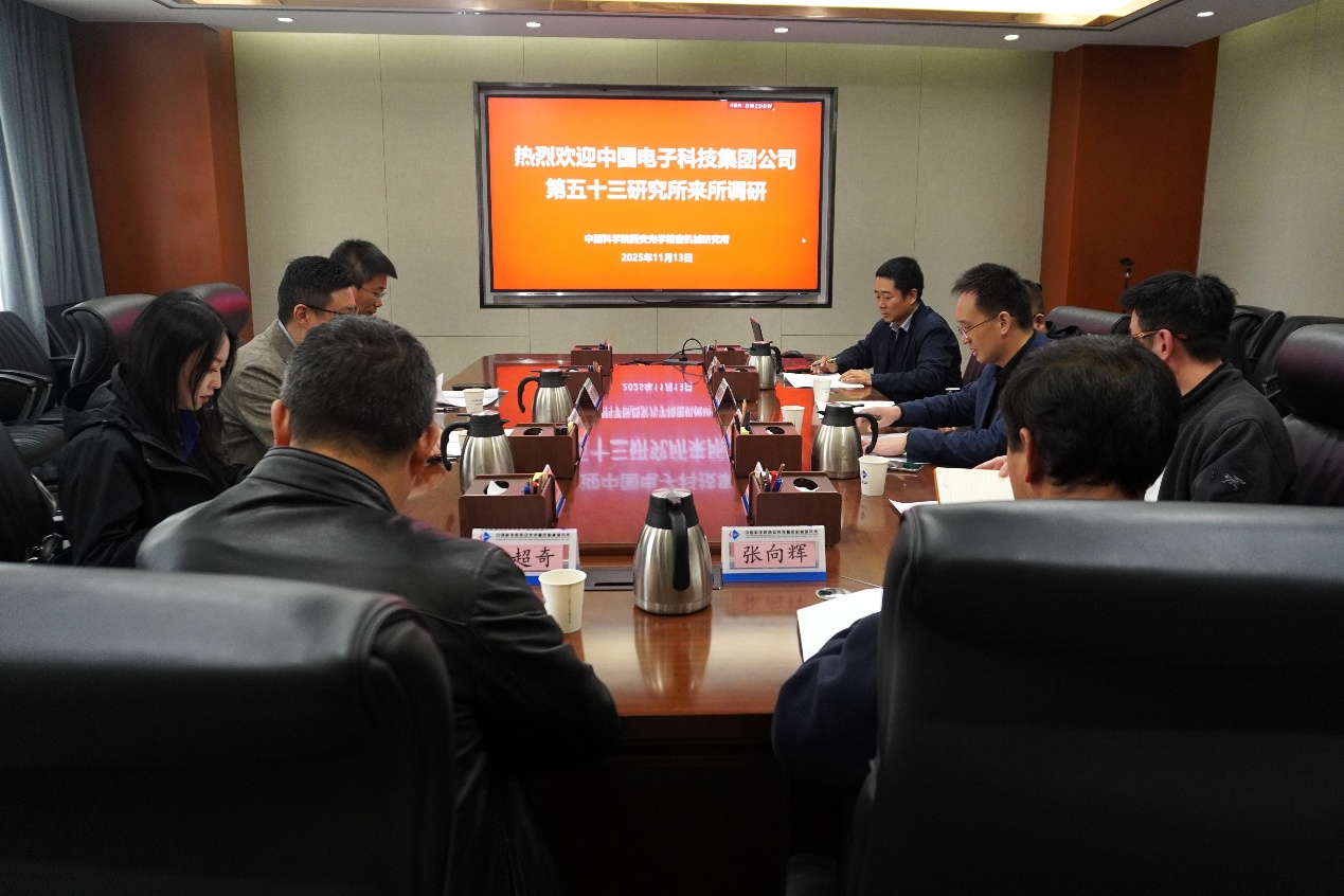 11月13日,中國電子科技集團(tuán)公司第五十三研究所(以下簡稱“五十三所”)副所長戴萬田一行訪問中國科學(xué)院西安光機(jī)所,圍繞貫徹落實國家“十五五”規(guī)劃建議精神,聚焦深化科研合作、推動科技成果轉(zhuǎn)化等議題開展座談交流。西安光機(jī)所綜合辦公室主任李廣路主持座談,工程科研處處長楊永清、西光產(chǎn)業(yè)發(fā)展有限公司總經(jīng)理周祚峰及相關(guān)科研人員參加座談。
